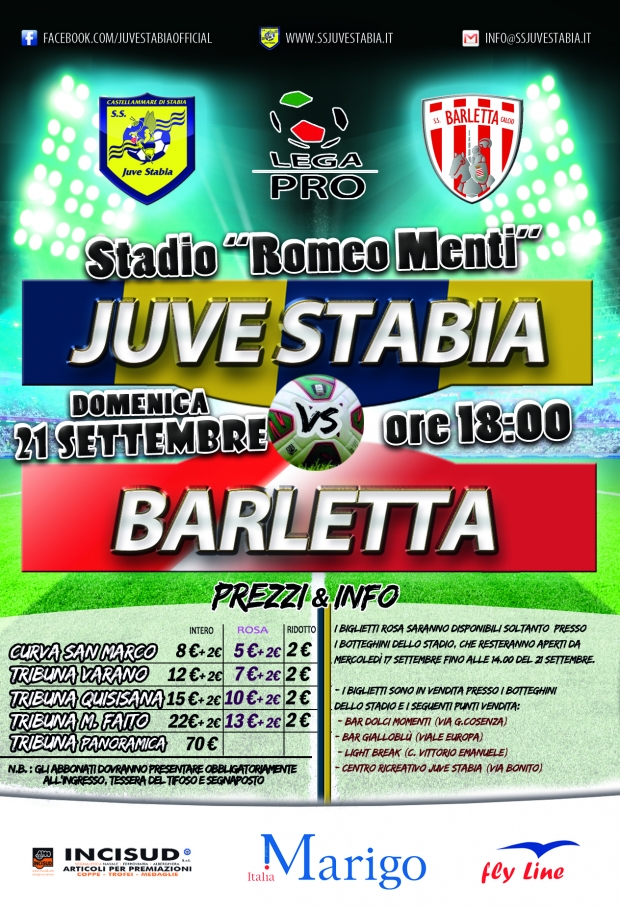 S.S. Juve Stabia rende noto che sono disponibili in prevendita, fino alle ore 18,00 del 21 settembre, i tagliandi di ingresso per assistere alla gara Juve Stabia-Barletta, che si disputerà domenica 21 settembre alle ore 18,00 allo Stadio “Romeo Menti”, valevole per la 4a giornata del Girone C della Lega Pro Divisione Unica 2014/2015.
