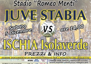 S.S. Juve Stabia rende noto che sono disponibili in prevendita, fino alle ore 14,00 del 5 dicembre, i tagliandi di ingresso per assistere alla gara Juve Stabia-Ischia Isolaverde, che si disputerà sabato 5 dicembre alle ore 14,00 allo Stadio “Romeo Menti”, valevole per la 14a giornata del Girone C della Lega Pro Divisione Unica 2015/2016.