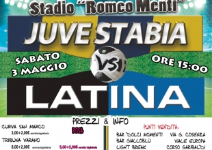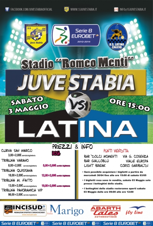 S.S. Juve Stabia rende noto che sono disponibili in prevendita, fino alle ore 15,00 del 3 maggio, i tagliandi di ingresso per assistere alla gara Juve Stabia-Latina, incontro valido per la 37° giornata della Serie B Eurobet 2013/2014, che si disputerà sabato 3 maggio alle ore 15,00 allo Stadio "Romeo Menti".