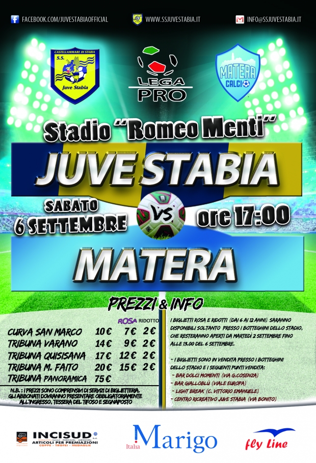 S.S. Juve Stabia rende noto che sono disponibili in prevendita, fino alle ore 17,00 del 6 settembre, i tagliandi di ingresso per assistere alla gara Juve Stabia-Matera, che si disputerà sabato 6 settembre alle ore 17,00 allo Stadio “Romeo Menti”, valevole per la 2° giornata del Girone C della Lega Pro Divisione Unica 2014/2015.
