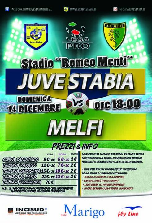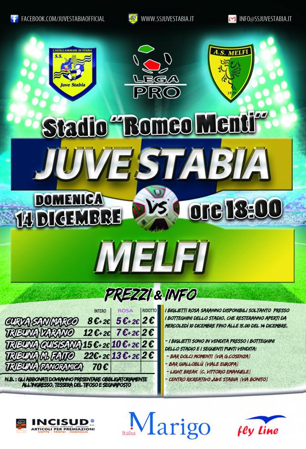 S.S. Juve Stabia rende noto che sono disponibili in prevendita, fino alle ore 18,00 del 14 dicembre, i tagliandi di ingresso per assistere alla gara Juve Stabia-Melfi, in programma domenica 14 dicembre alle ore 18,00 allo Stadio “Romeo Menti” di Castellammare di Stabia e valevole per la 17a giornata del Girone C della Lega Pro Divisione Unica 2014/2015.