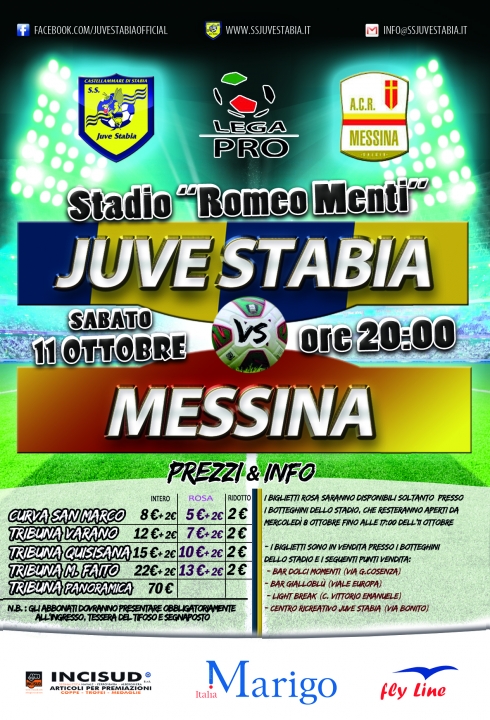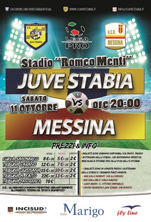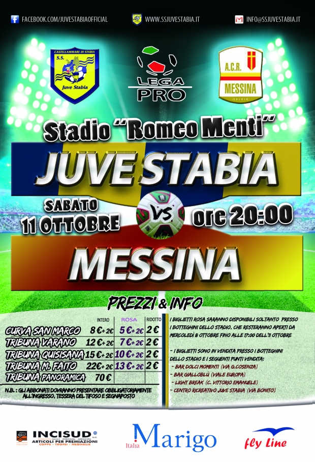 S.S. Juve Stabia rende noto che sono disponibili in prevendita, fino alle ore 20,00 dell’11 ottobre, i tagliandi di ingresso per assistere alla gara Juve Stabia-Messina, che si disputerà sabato 11 ottobre alle ore 20,00 allo Stadio “Romeo Menti”, valevole per la 8a giornata del Girone C della Lega Pro Divisione Unica 2014/2015.
