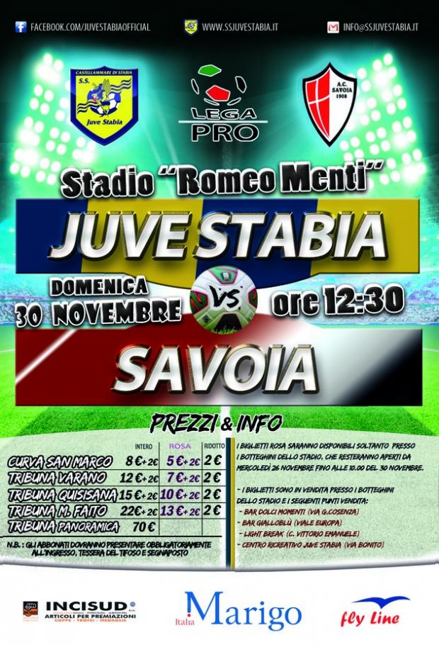 S.S. Juve Stabia rende noto che sono disponibili in prevendita, fino alle ore 12,30 del 30 novembre, i tagliandi di ingresso per assistere alla gara Juve Stabia-Savoia, che si disputerà domenica 30 novembre alle ore 12,30 allo Stadio “Romeo Menti”, valevole per la 15a giornata del Girone C della Lega Pro Divisione Unica 2014/2015.