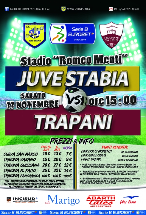 S.S. Juve Stabia S.p.A. rende noto che da oggi, martedì 19 novembre, sono disponibili in prevendita, i tagliandi di ingresso per assistere alla gara Juve Stabia-Trapani, di sabato 23 novembre alle ore 15,00 allo Stadio Romeo Menti, valevole per la 15° giornata della Serie B Eurobet 2013/2014. Anche per questa partita sono previsti forti sconti per chi acquisterà il biglietto in prevendita, entro venerdì sera.Di seguito i prezzi relativi ad ogni singolo settore: