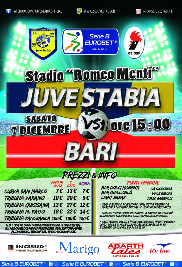 S.S. Juve Stabia S.p.A. chiama a raccolta i propri tifosi in questo delicato e difficile momento della stagione, adottando per la gara con il Bari prezzi scontati, per favorire un significativo afflusso di pubblico, nella consapevolezza che lo stesso nei momenti topici ha sempre rappresentato l'arma in più e potrà sicuramente trascinare i gialloblù alla vittoria.Per l'occasione fino a venerdì 6 dicembre per chi aderirà all'iniziativa ci sarà la possibilità di acquistare i tagliandi d'ingresso con uno sconto mediamente di circa il 50%.