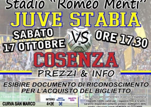 Inoltre, S.S. Juve Stabia rende noto che i tagliandi di ingresso per assistere alla gara Juve Stabia-Cosenza, valevole per la 7a giornata del Girone C della Lega Pro Divisione Unica 2015/2016, sono disponibili in prevendita, fino alle ore 17,30 del 17 ottobre.