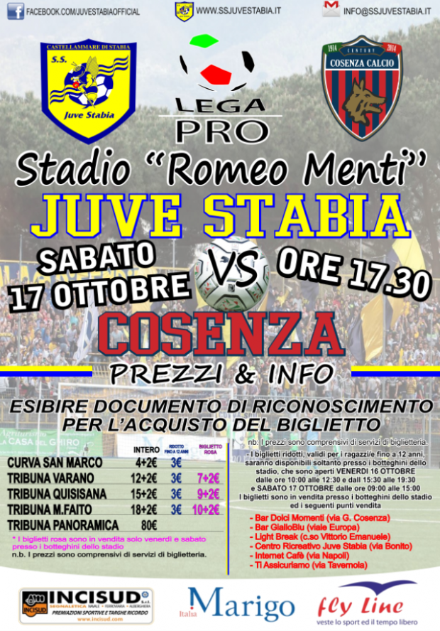 Inoltre, S.S. Juve Stabia rende noto che i tagliandi di ingresso per assistere alla gara Juve Stabia-Cosenza, valevole per la 7a giornata del Girone C della Lega Pro Divisione Unica 2015/2016, sono disponibili in prevendita, fino alle ore 17,30 del 17 ottobre.