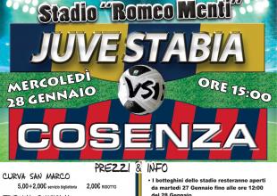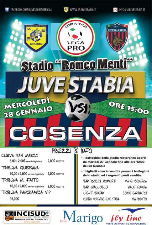 S.S. Juve Stabia rende noto che sono disponibili in prevendita, fino alle ore 15,00 del 28 gennaio, i tagliandi di ingresso per assistere alla gara Juve Stabia-Cosenza, che si disputerà mercoledì 28 gennaio alle ore 15,00 allo Stadio “Romeo Menti”, valevole per i Quarti di Finale della Coppa Italia Lega Pro 2014/2015.