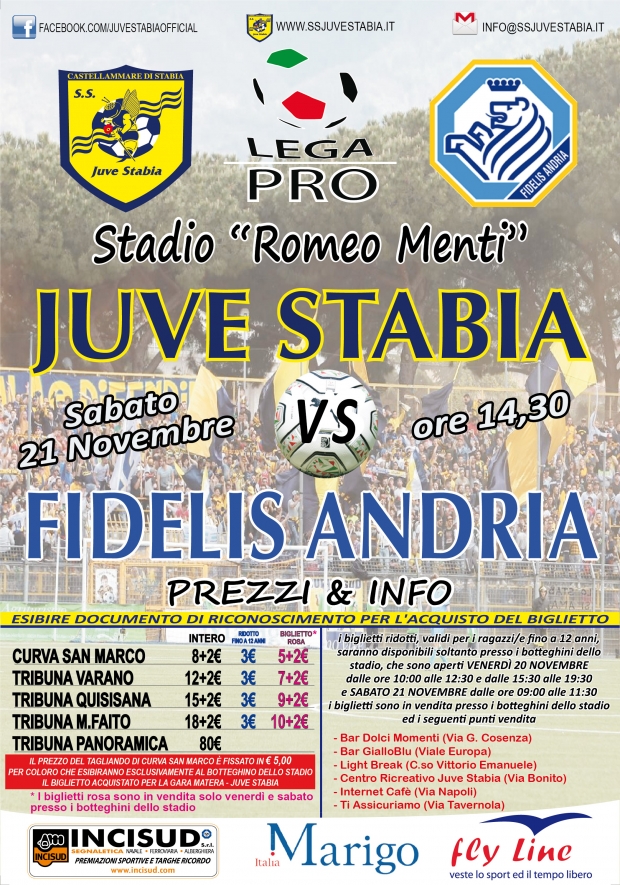 S.S. Juve Stabia rende noto inoltre che sono disponibili in prevendita anche i BIGLIETTI ROSA e i RIDOTTI (per bambini fino a 12 anni) per assistere alla gara Juve Stabia-Fidelis Andria.