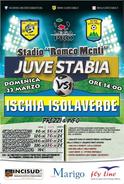 S.S. Juve Stabia rende noto che sono disponibili in prevendita, fino alle ore 14,00 di domenica 22 marzo, i tagliandi di ingresso per assistere alla gara Juve Stabia-Ischia Isolaverde, che si disputerà domenica 22 marzo alle ore 14,00 allo Stadio “Romeo Menti”, valevole per la 31a giornata del Girone C della Lega Pro Divisione Unica 2014/2015.