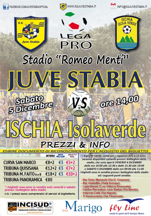 S.S. Juve Stabia rende noto che sono disponibili in prevendita, fino alle ore 14,00 del 5 dicembre, i tagliandi di ingresso per assistere alla gara Juve Stabia-Ischia Isolaverde, che si disputerà sabato 5 dicembre alle ore 14,00 allo Stadio “Romeo Menti”, valevole per la 14a giornata del Girone C della Lega Pro Divisione Unica 2015/2016.