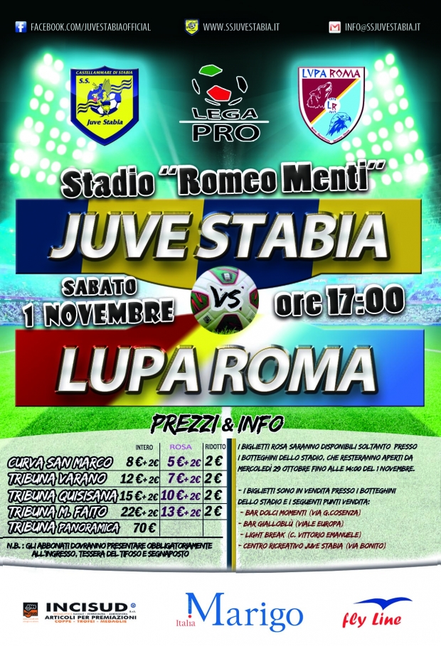 S.S. Juve Stabia rende noto inoltre che sono disponibili in prevendita anche i BIGLIETTI ROSA per assistere alla gara Juve Stabia-Lupa Roma, in programma sabato 1 novembre alle ore 17,00 allo Stadio "Romeo Menti" di Castellammare di Stabia e valevole per l'11a giornata del Girone C della Lega Pro Divisione Unica 2014/15.