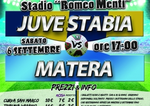 S.S. Juve Stabia rende noto che sono disponibili in prevendita, fino alle ore 17,00 del 6 settembre, i tagliandi di ingresso per assistere alla gara Juve Stabia-Matera, che si disputerà sabato 6 settembre alle ore 17,00 allo Stadio “Romeo Menti”, valevole per la 2° giornata del Girone C della Lega Pro Divisione Unica 2014/2015.