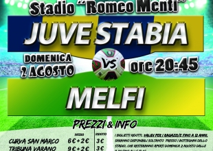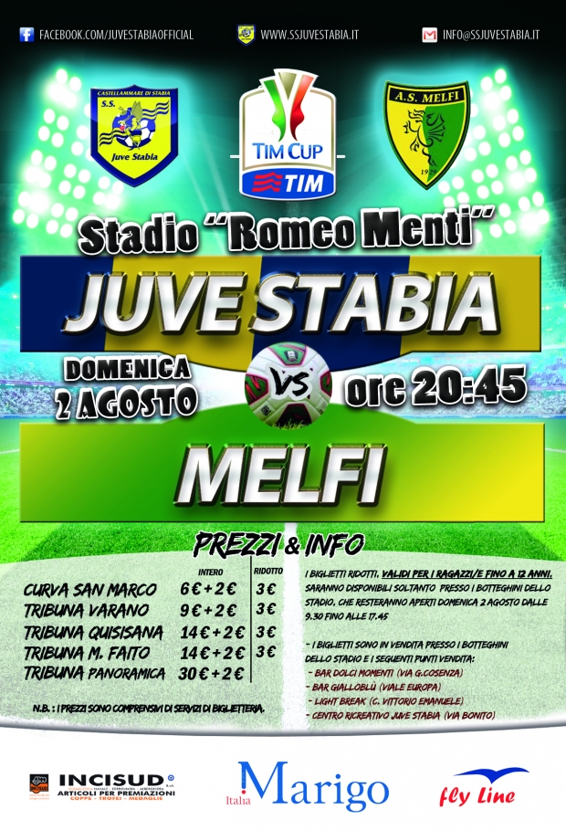 S.S. Juve Stabia rende noto che sono disponibili in prevendita, fino alle ore 20,45 di domenica 2 agosto, i tagliandi di ingresso per assistere alla gara Juve Stabia-Melfi, che si disputerà domenica 2 agosto alle ore 20,45 allo Stadio “Romeo Menti”, valevole per il primo turno della TIM Cup 2015/2016.