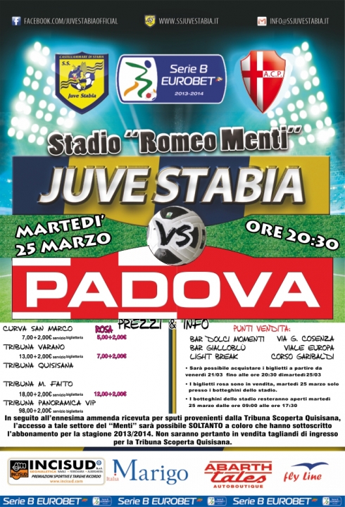 S.S. Juve Stabia S.p.A. rende noto che da oggi, venerdì 21 marzo, sono disponibili in prevendita, fino alle ore 20,30 del 25 marzo, i tagliandi di ingresso per assistere alla gara Juve Stabia-Padova, incontro valido per la 31° giornata della Serie B Eurobet 2013/2014, che si disputerà martedì 25 marzo alle ore 20,30 allo Stadio "Romeo Menti".