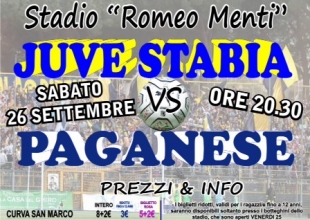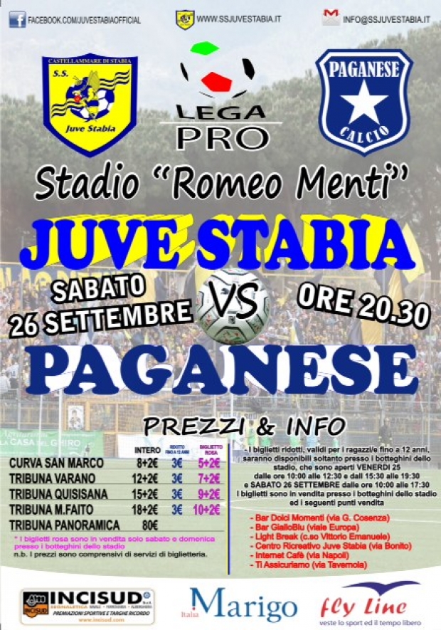 S.S. Juve Stabia rende noto che sono disponibili in prevendita, fino alle ore 20,30 del 26 settembre, i tagliandi di ingresso per assistere alla gara Juve Stabia-Paganese, che si disputerà sabato 26 settembre alle ore 20,30 allo Stadio “Romeo Menti”, valevole per la 4a giornata del Girone C della Lega Pro Divisione Unica 2015/2016.