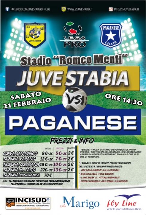 S.S. Juve Stabia rende noto che sono disponibili in prevendita, fino alle ore 14,30 di sabato 21 febbraio, i tagliandi di ingresso per assistere alla gara Juve Stabia-Paganese, che si disputerà sabato 21 febbraio alle ore 14,30 allo Stadio “Romeo Menti”, valevole per la 26a giornata del Girone C della Lega Pro Divisione Unica 2014/2015.