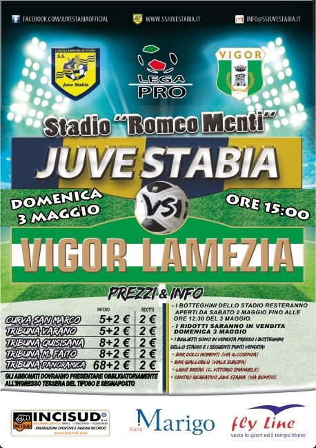 S.S. Juve Stabia rende noto che in occasione della gara Juve Stabia-Vigor Lamezia, in programma domenica 3 maggio alle ore 15,00, valevole per la 37a giornata del Girone C della Lega Pro Divisione Unica 2014/2015, saranno in vendita biglietti a prezzi popolari per tutti i settori dello Stadio “Romeo Menti” di Castellammare di Stabia. Data l’importanza del match ai fini della classifica e del raggiungimento dei play-off, è necessario il sostegno di tutti i nostri tifosi!